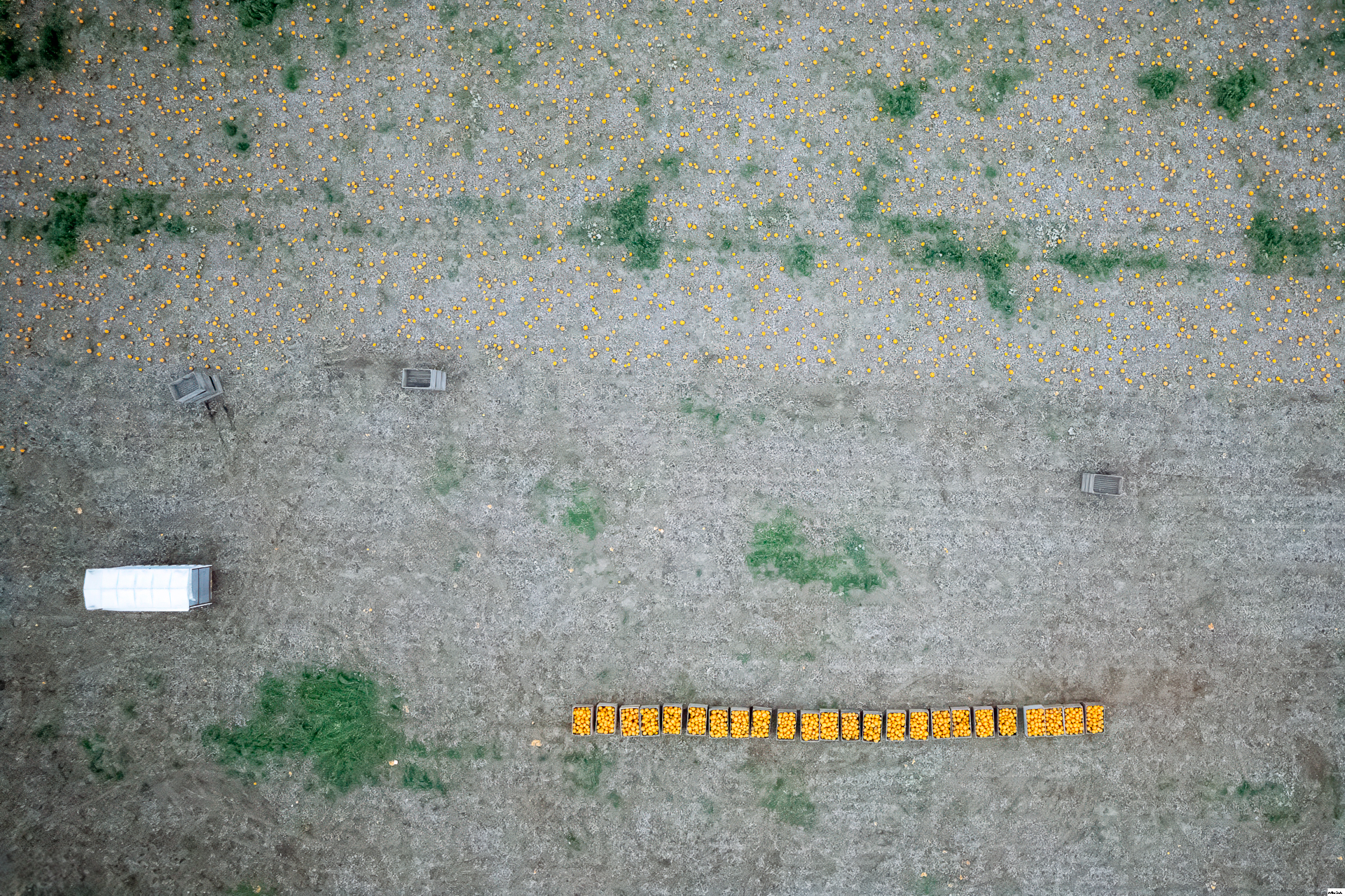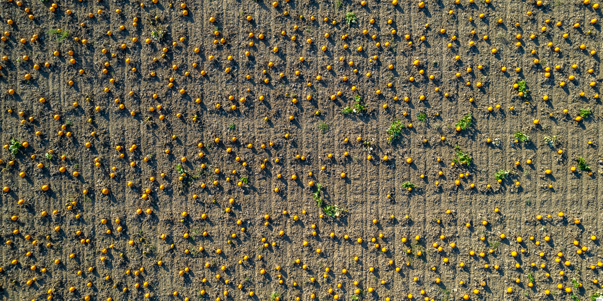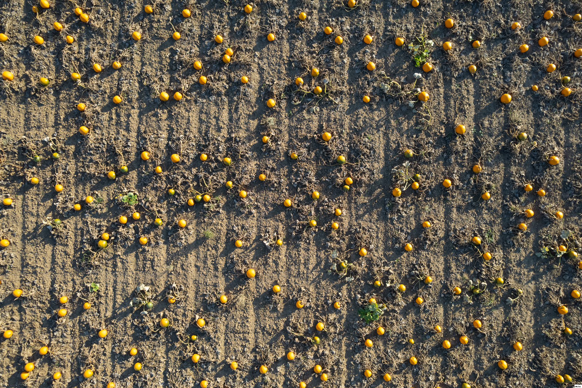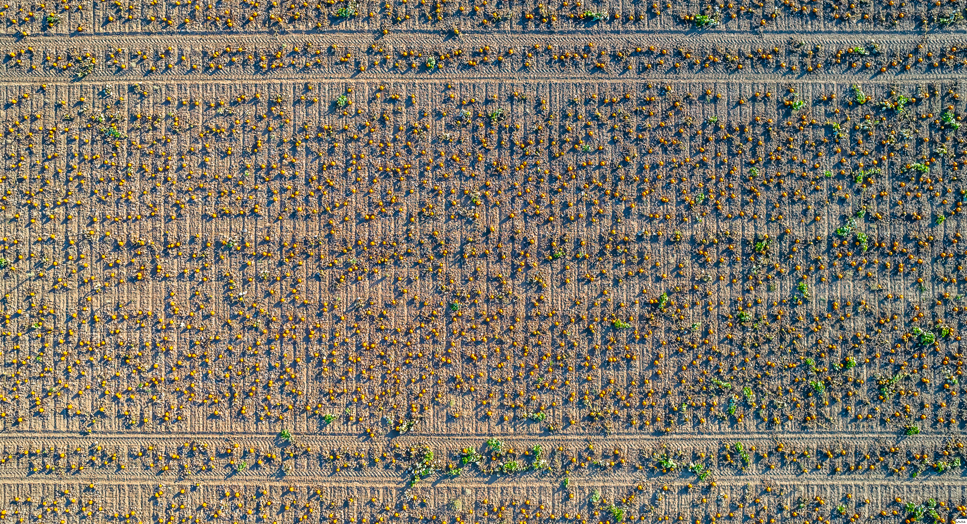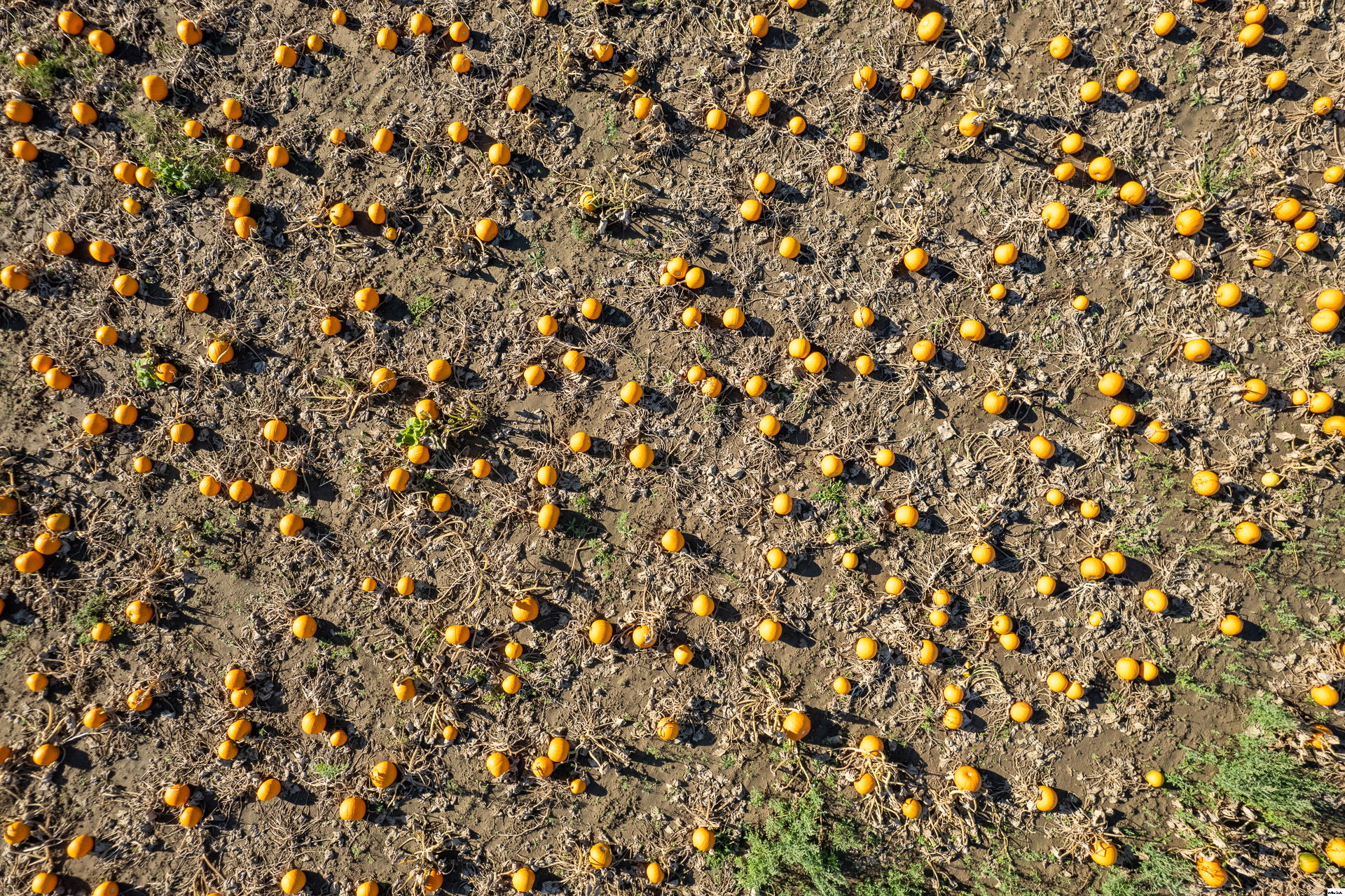 From above, every unharvested field of pumpkins looks different. And it depends on many things – the colour of the soil, how ripe the crop is, whether the plants’ leaves have withered, how many plants didn’t survive to adulthood, the quality of the light on that day etc.