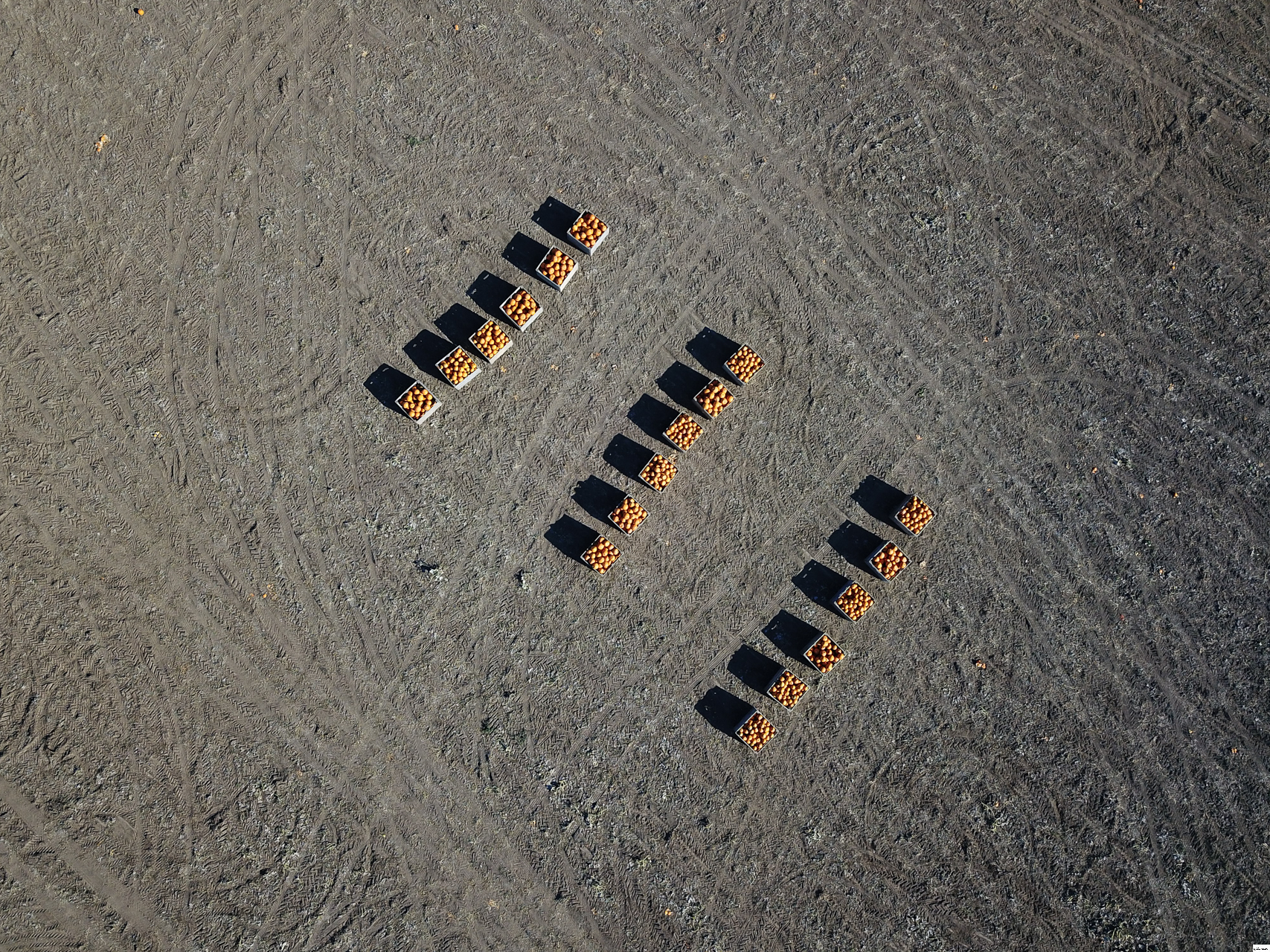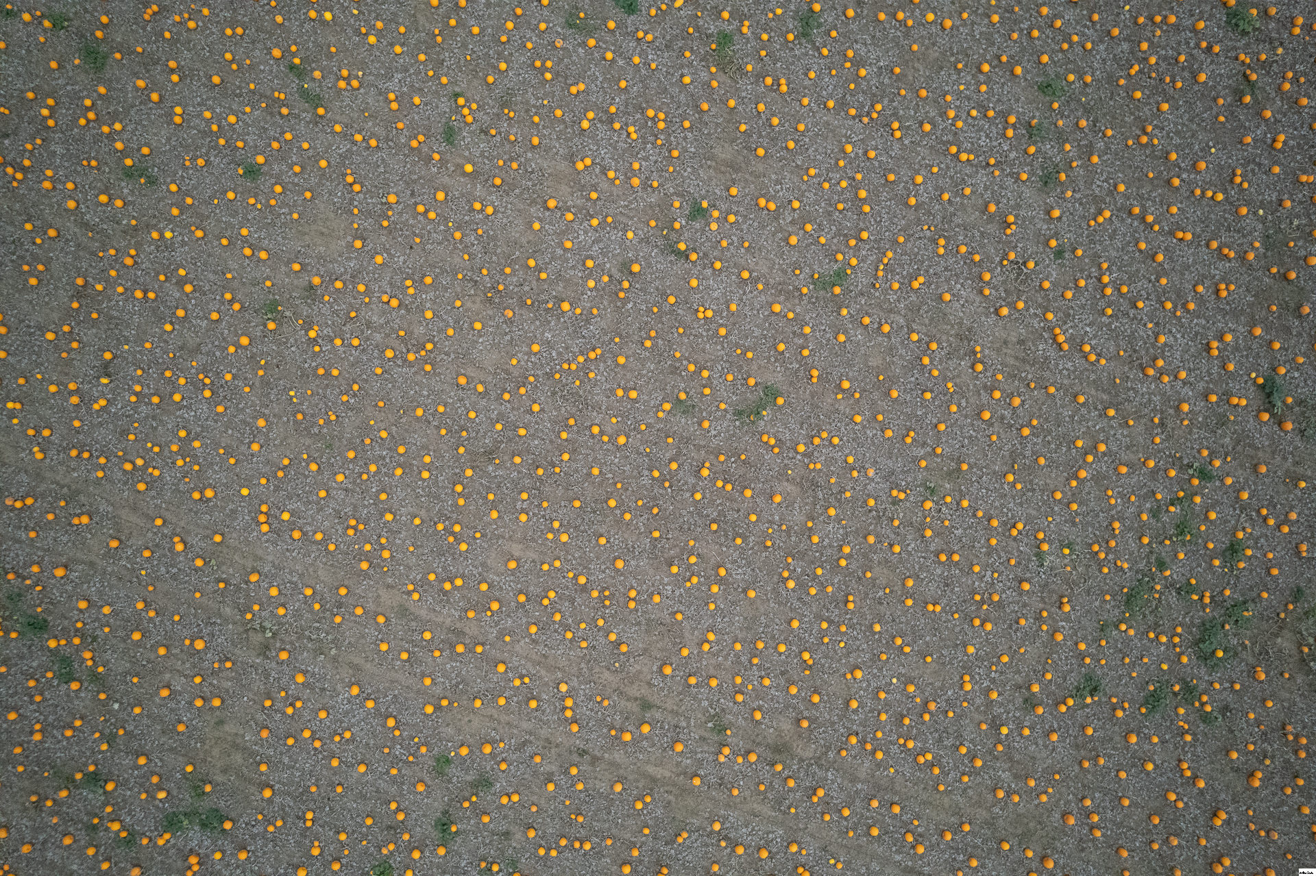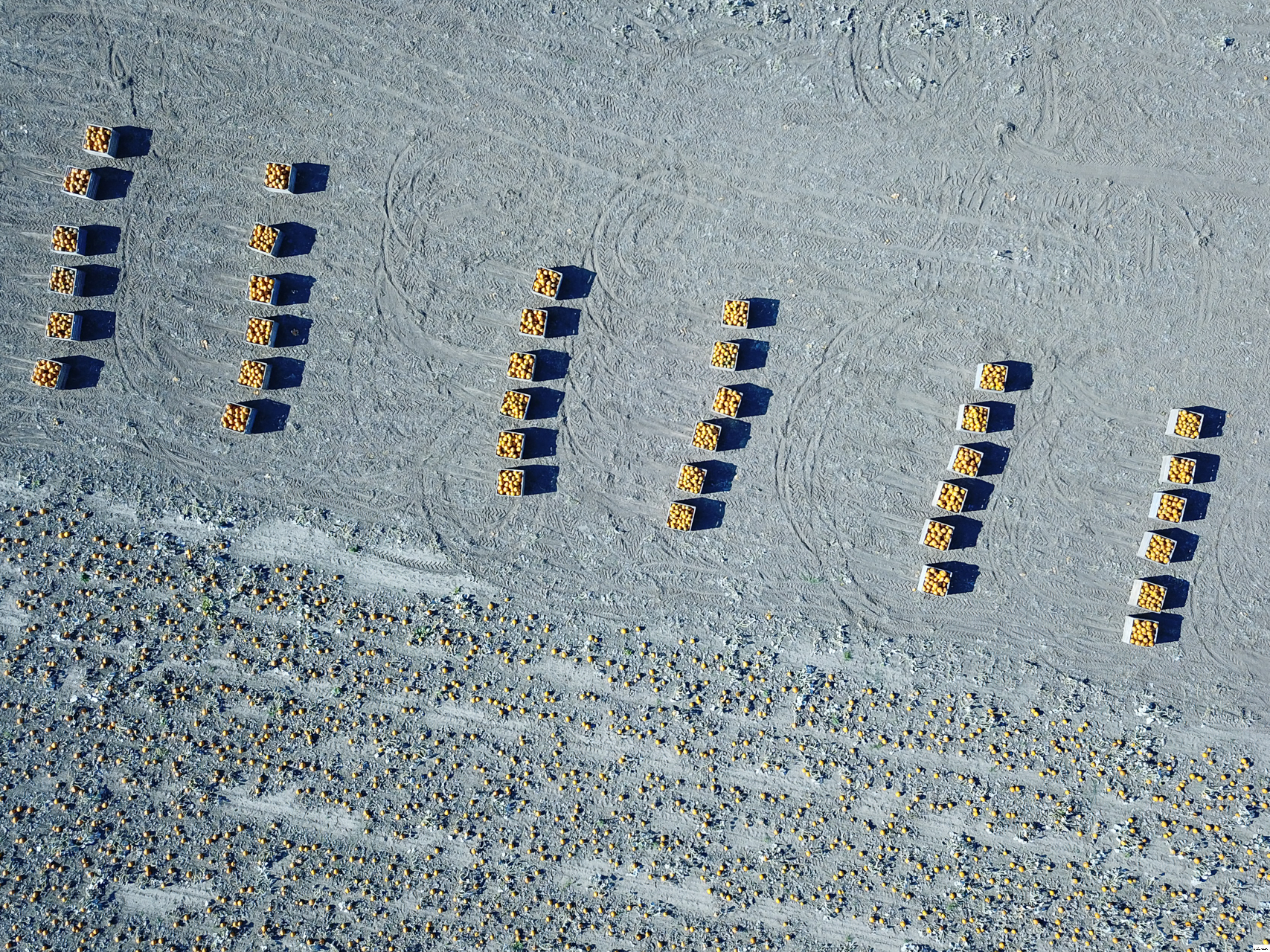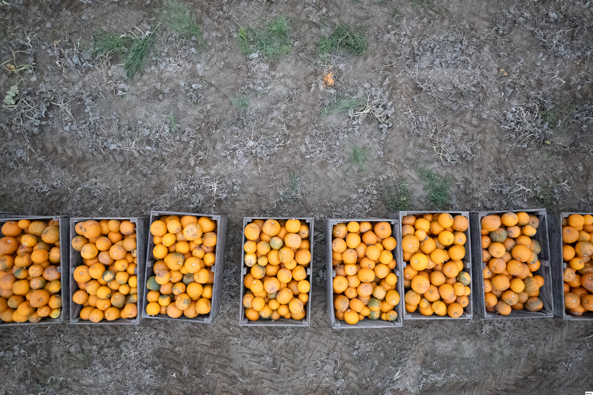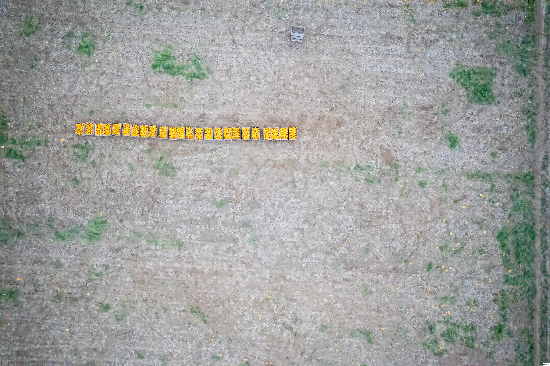 From above, every unharvested field of pumpkins looks different. And it depends on many things – the colour of the soil, how ripe the crop is, whether the plants’ leaves have withered, how many plants didn’t survive to adulthood, the quality of the light on that day etc.