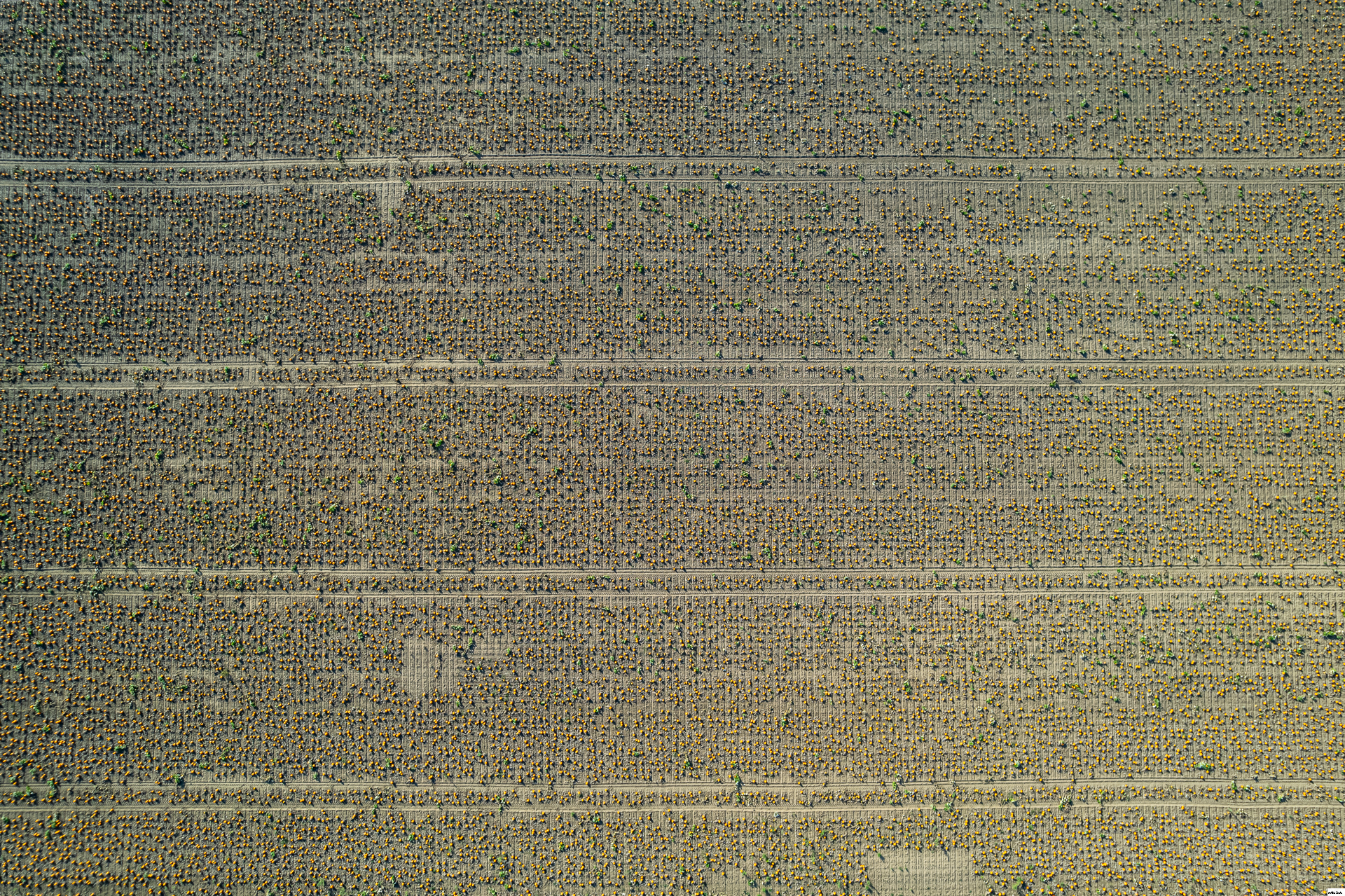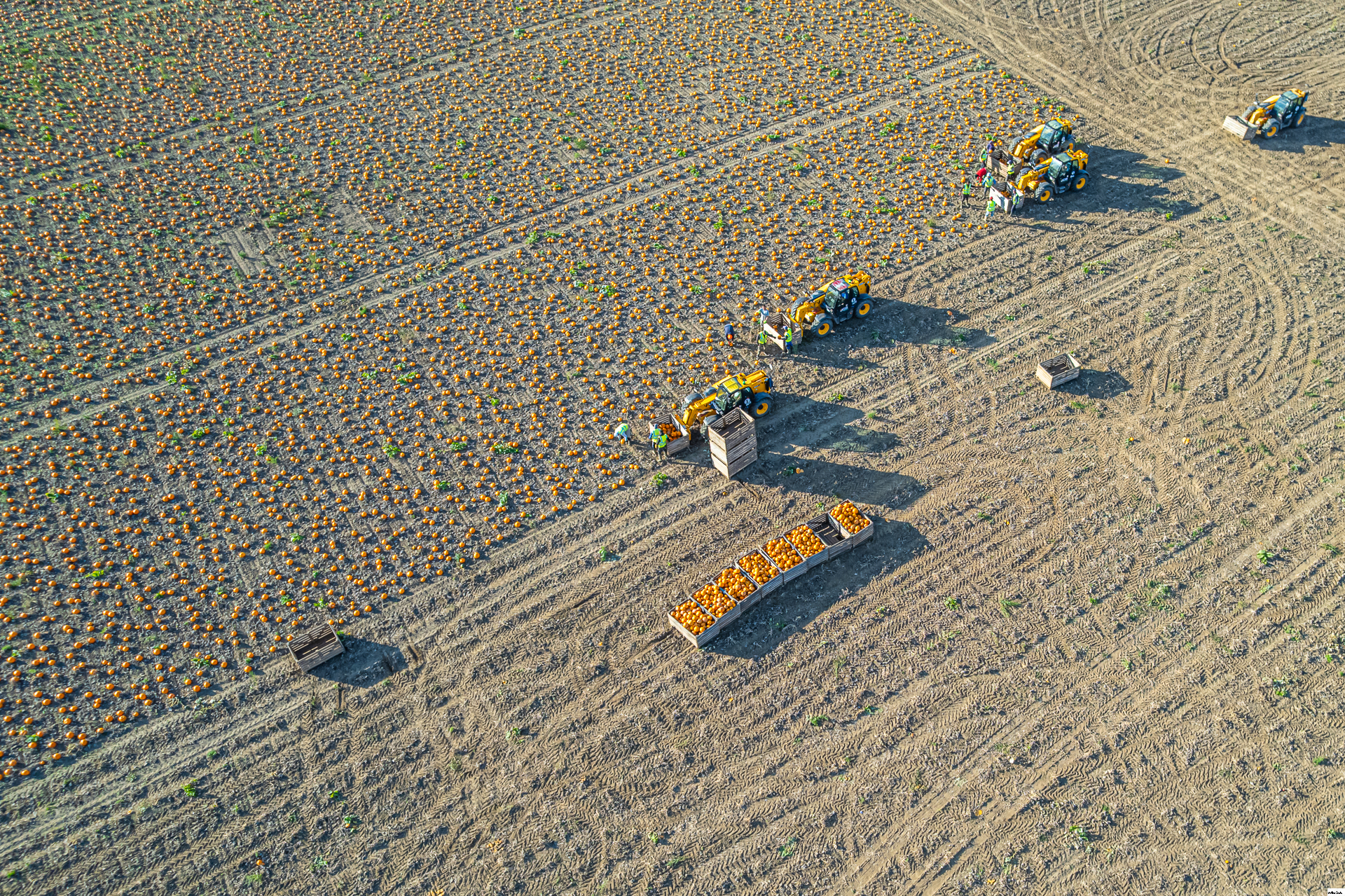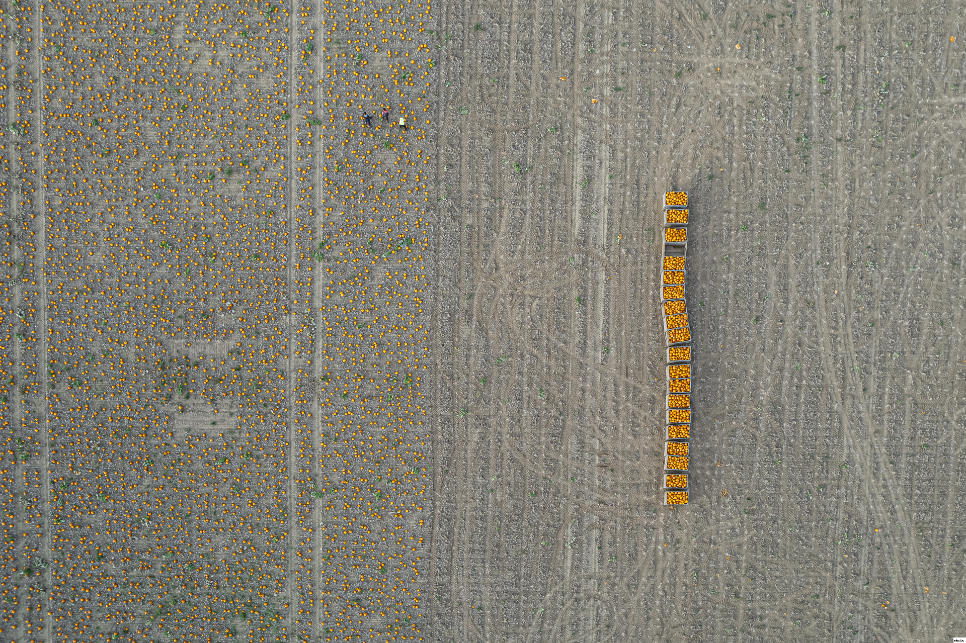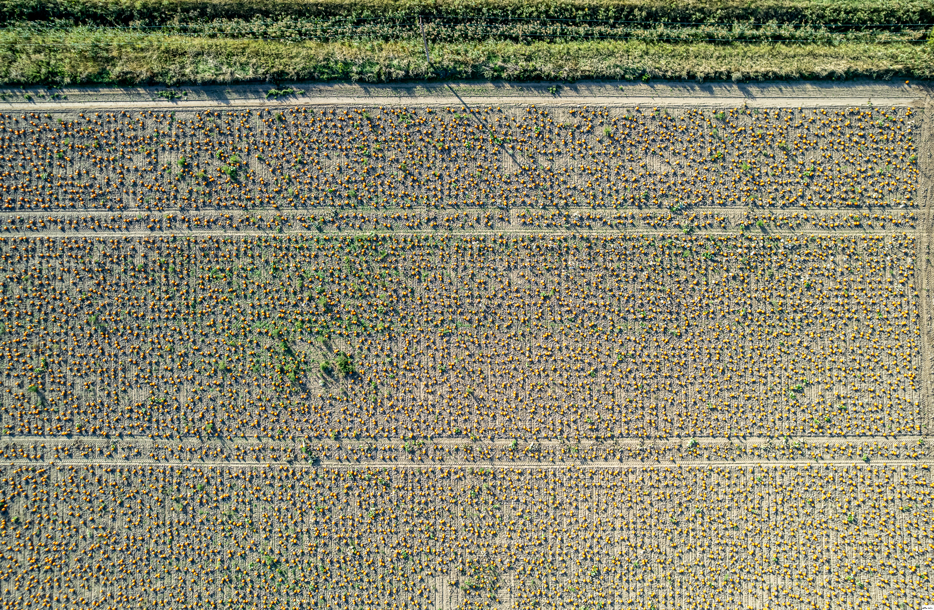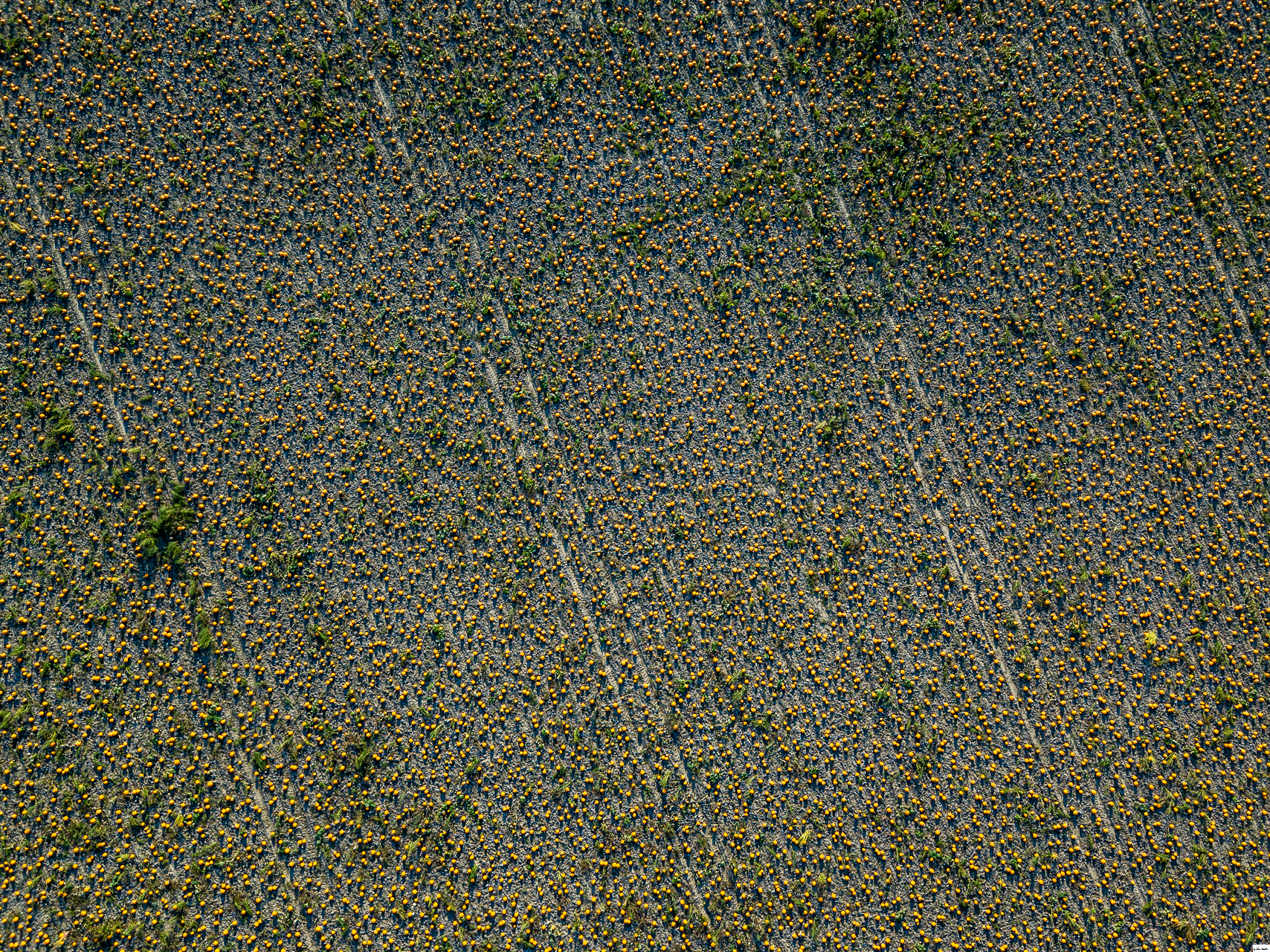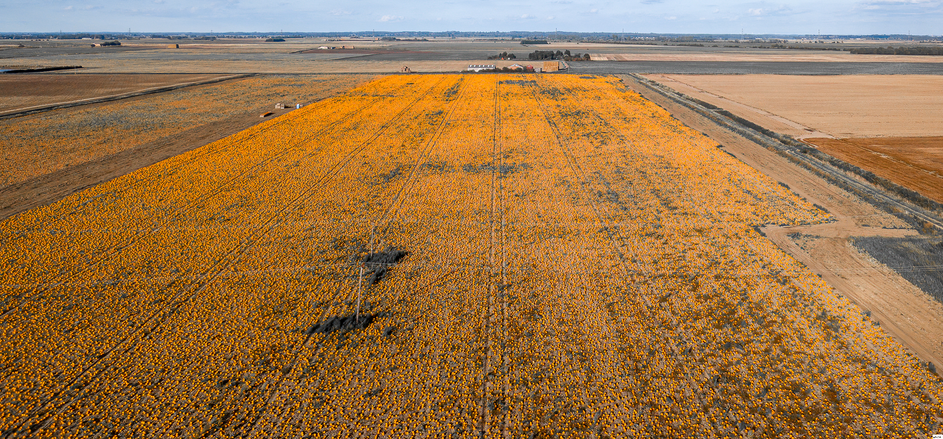 From above, every unharvested field of pumpkins looks different. And it depends on many things – the colour of the soil, how ripe the crop is, whether the plants’ leaves have withered, how many plants didn’t survive to adulthood, the quality of the light on that day etc.