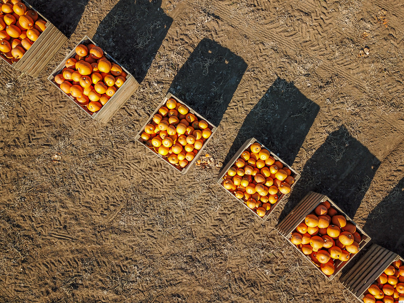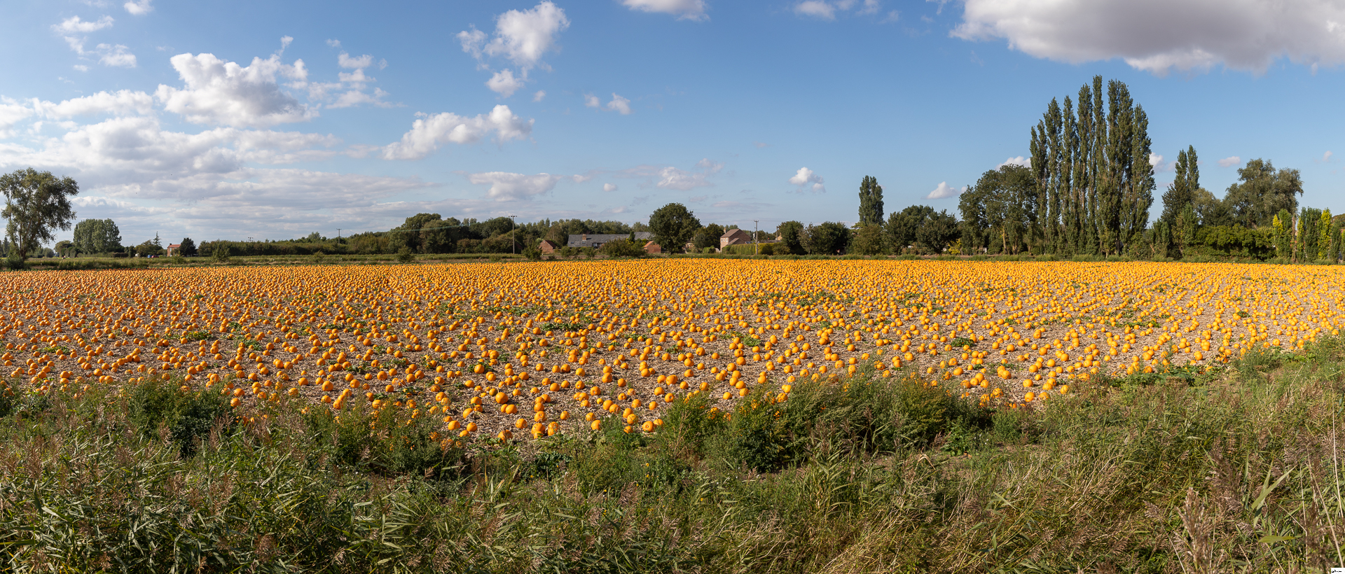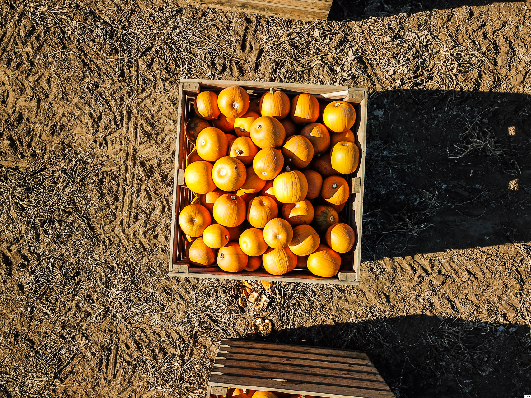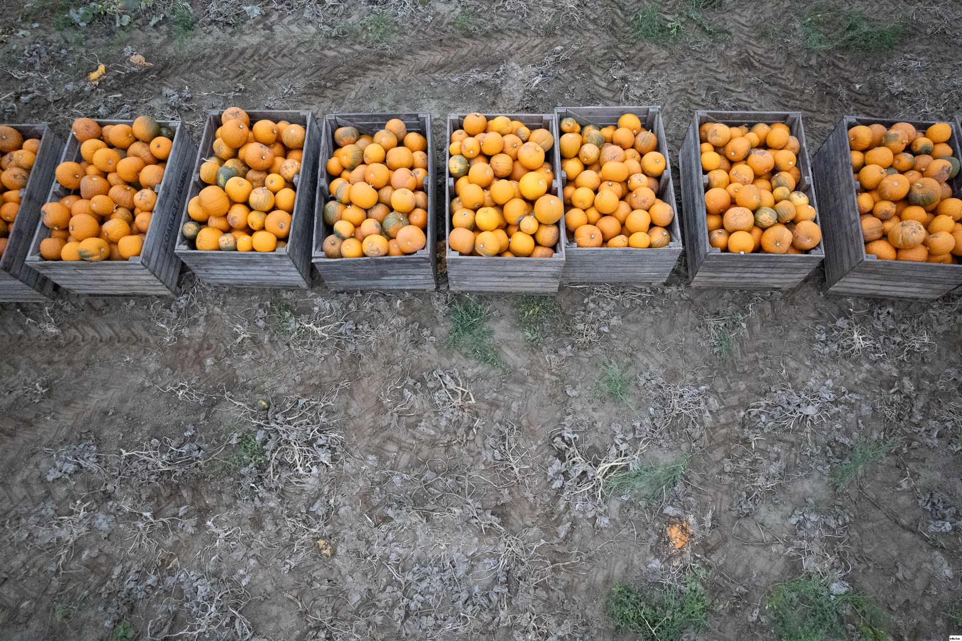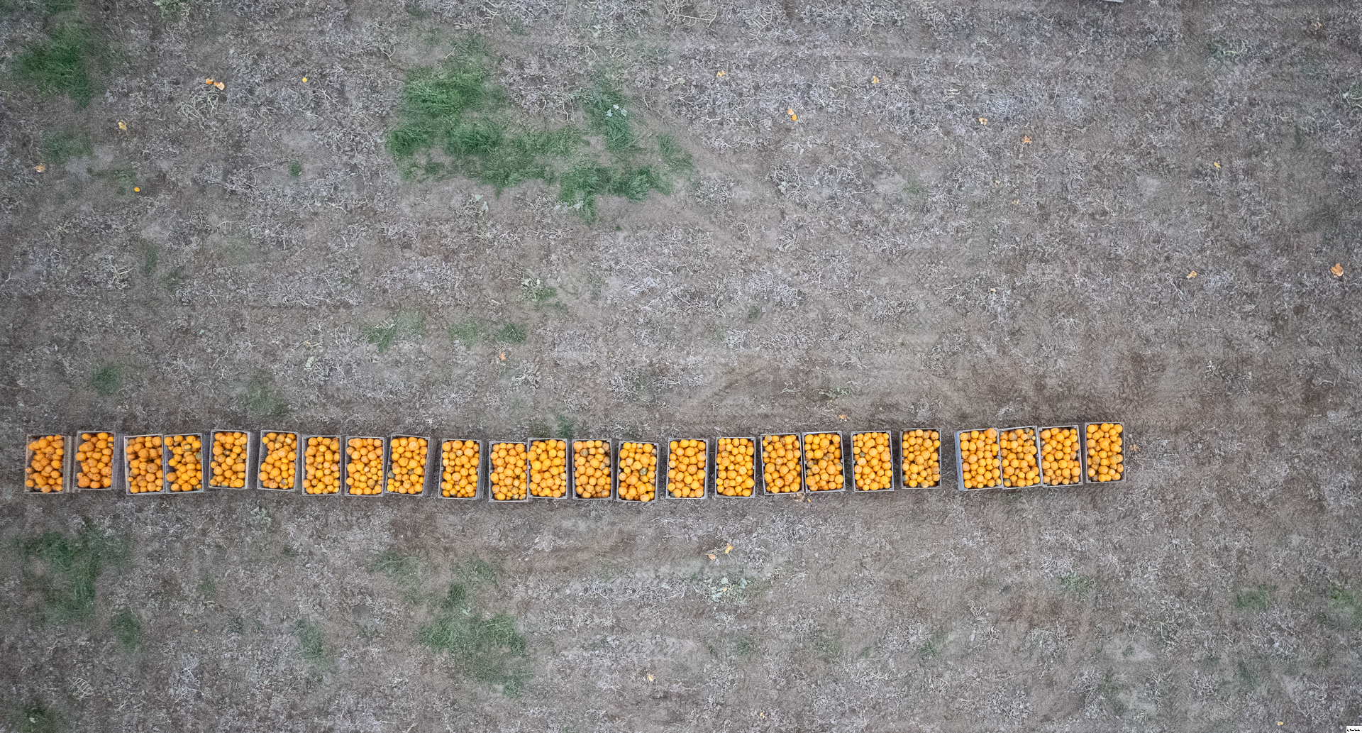 From above, every unharvested field of pumpkins looks different. And it depends on many things – the colour of the soil, how ripe the crop is, whether the plants’ leaves have withered, how many plants didn’t survive to adulthood, the quality of the light on that day etc.