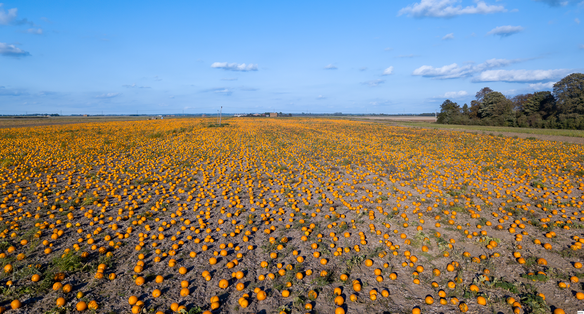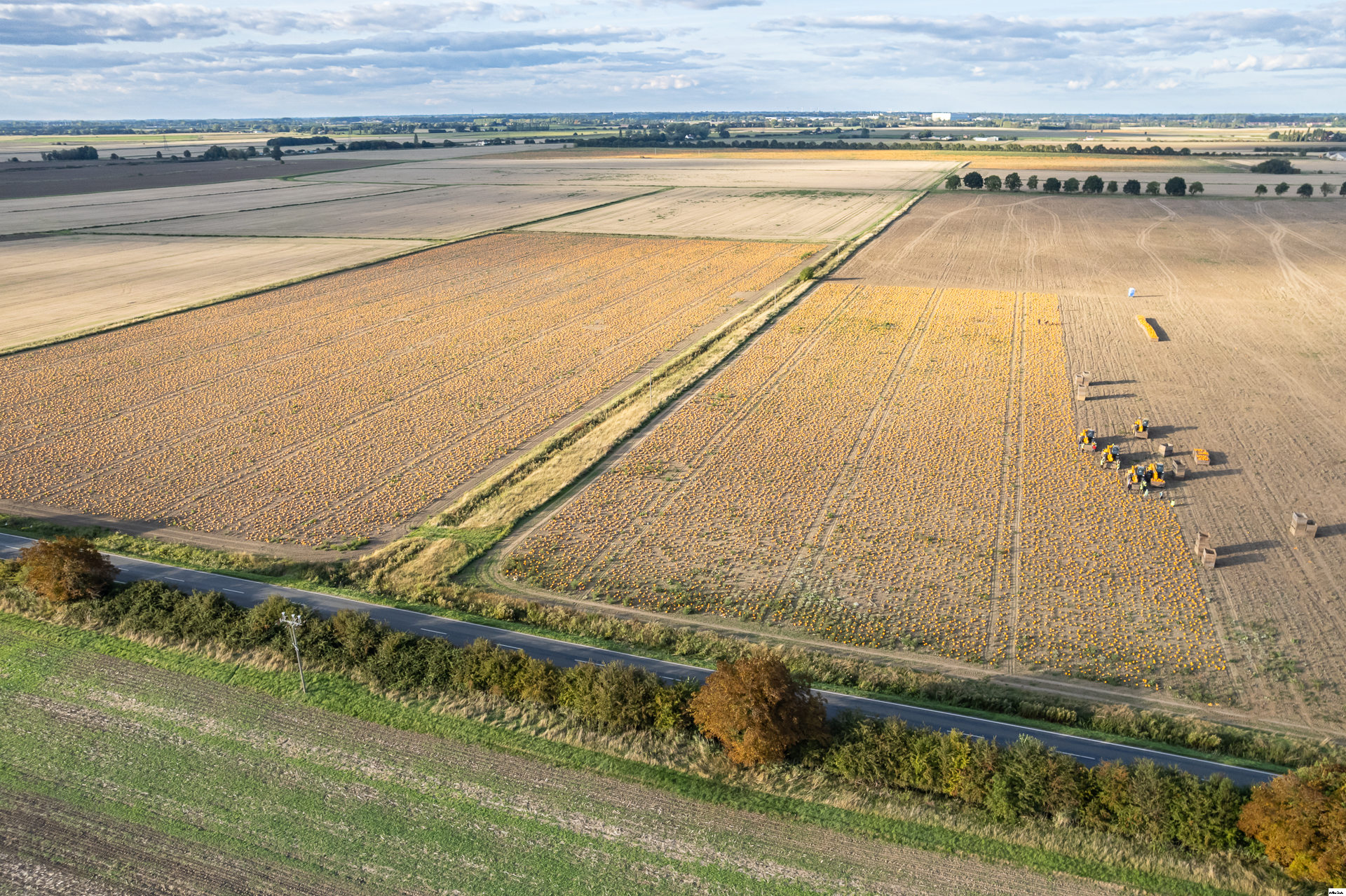 Every year, many millions of pumpkins are grown in the silt fens around Emneth, Outwell, Upwell and Three Holes for the Halloween trade. From above, they make wonderful colourful patterns, especially when they are being harvested. So, in mid to late September, every year since I got my first drone we have made a trip to the area just to see the pumpkins. One farm alone grows up to four million pumpkins a year … just for Tesco!