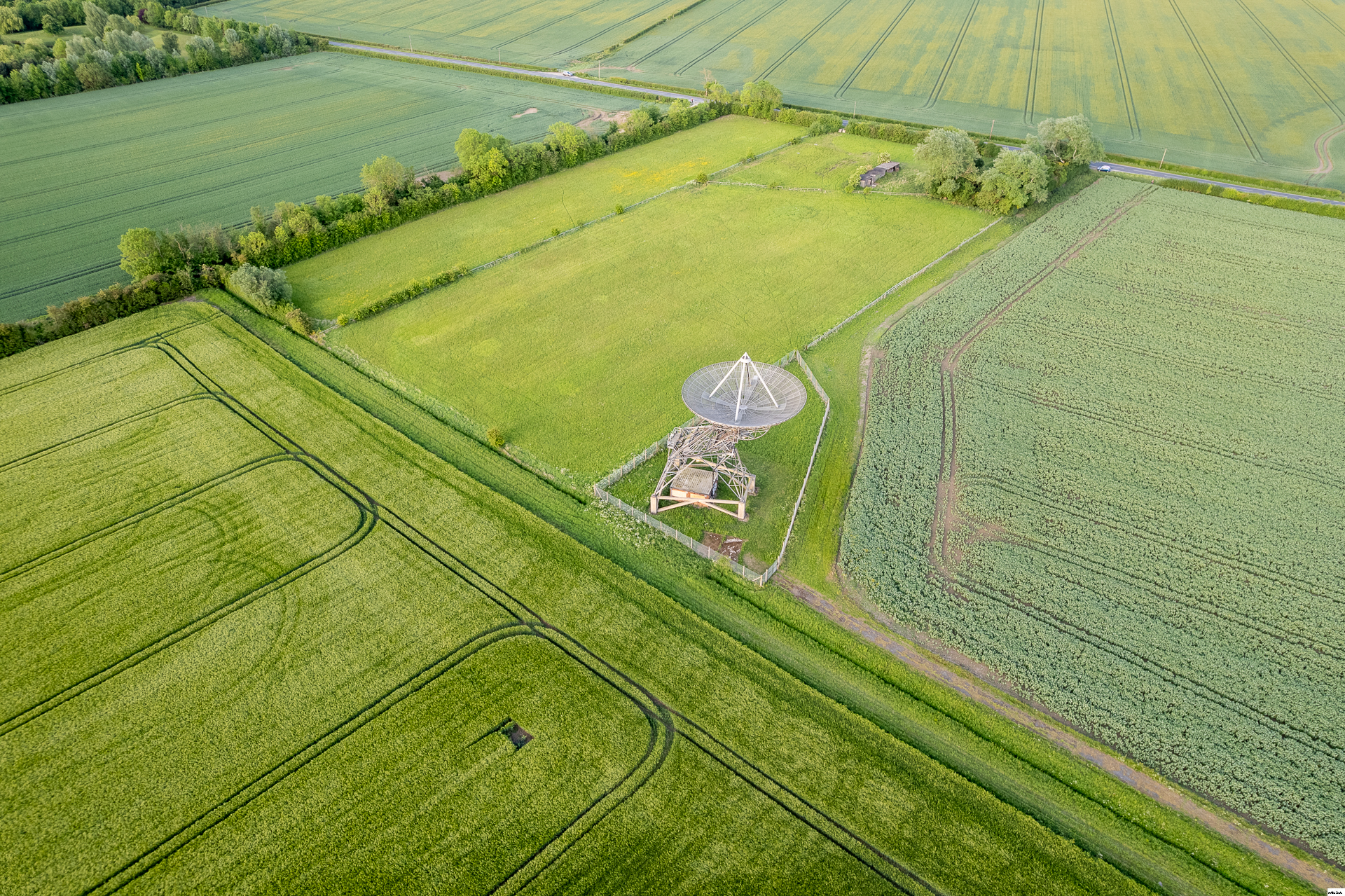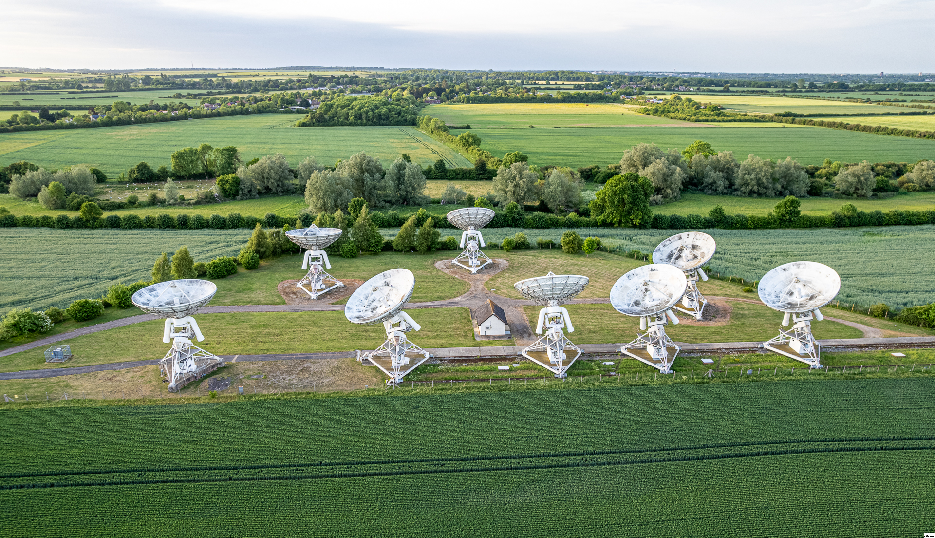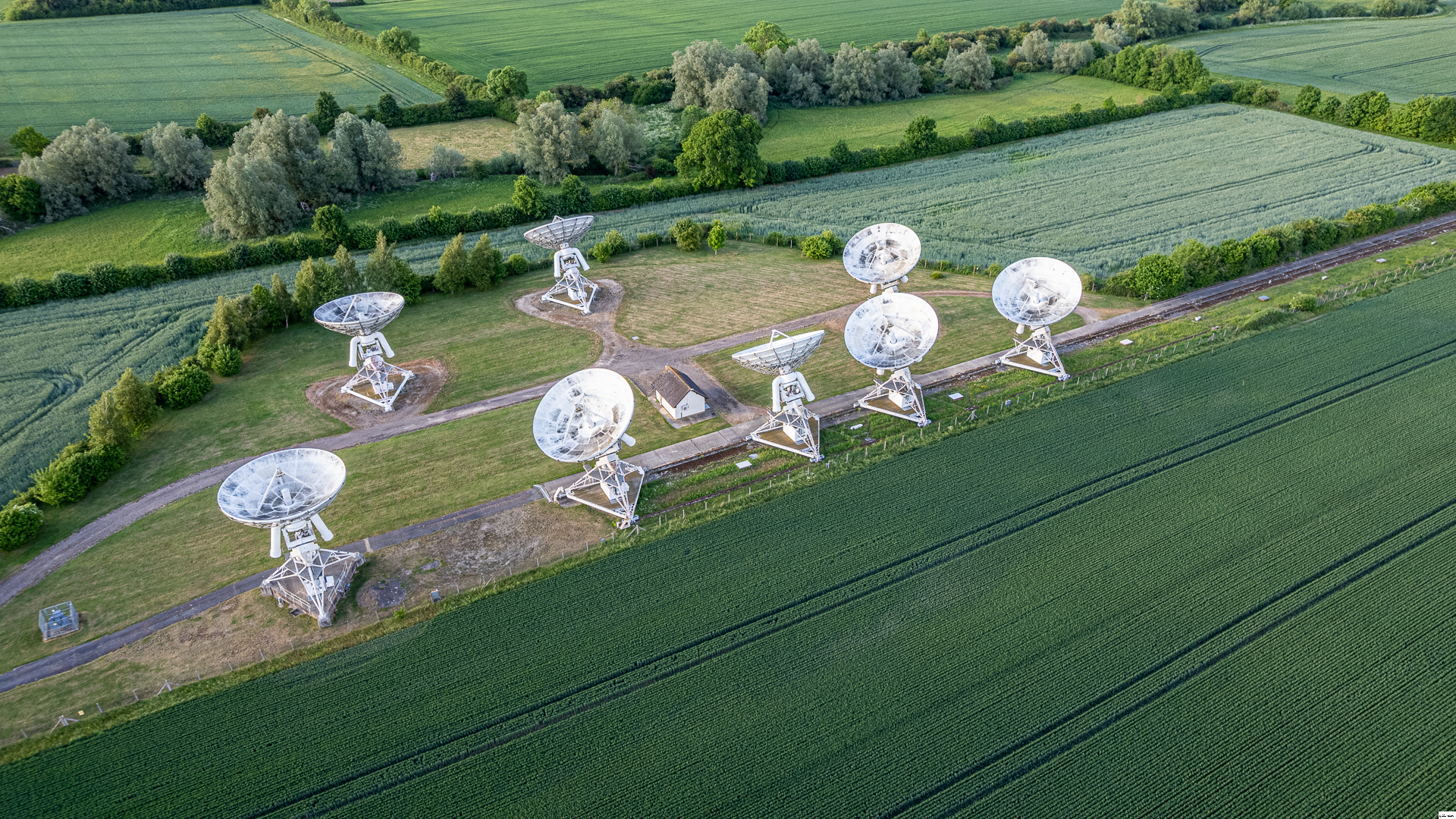 Cambridge University’s Mullard Radio Astronomy Laboratory, at Lord’s Bridge, near Barton. Built a decontaminated WW2 mustard gas depot! The line of white dishes sits on the route of the old Oxford-Cambridge railway.