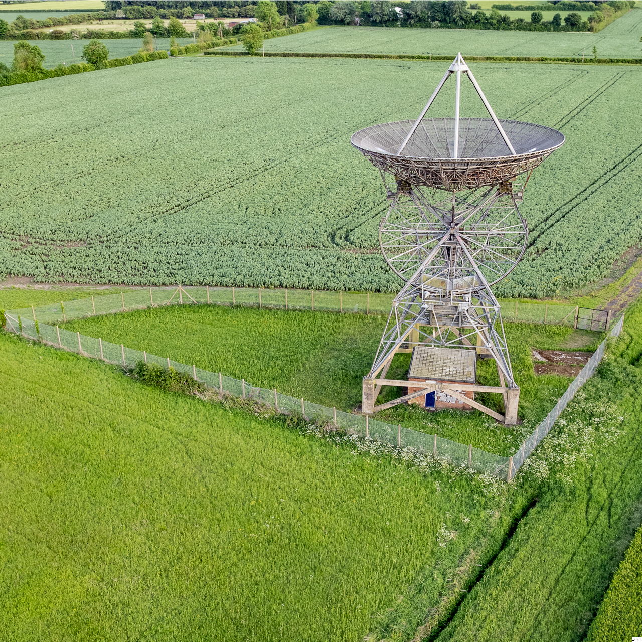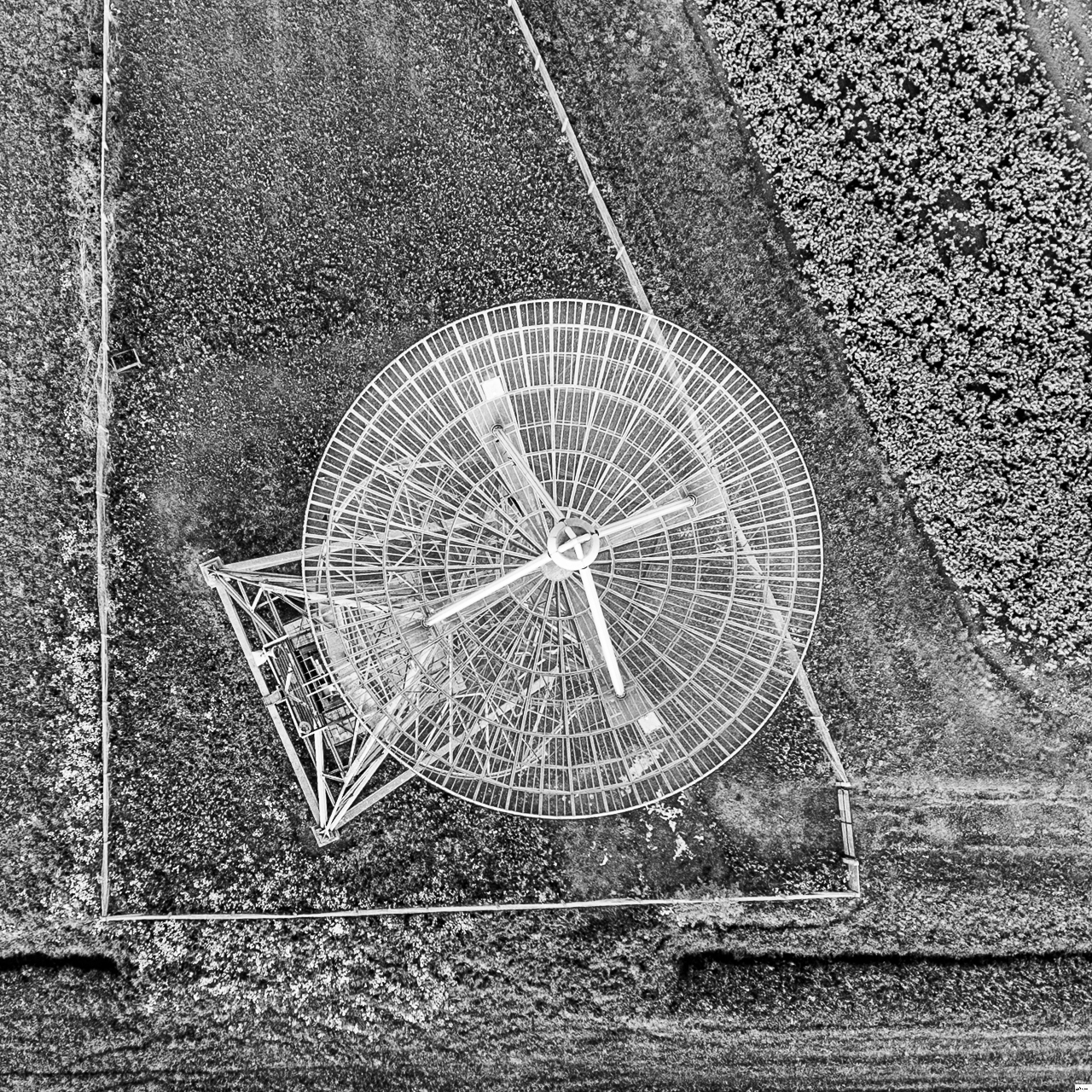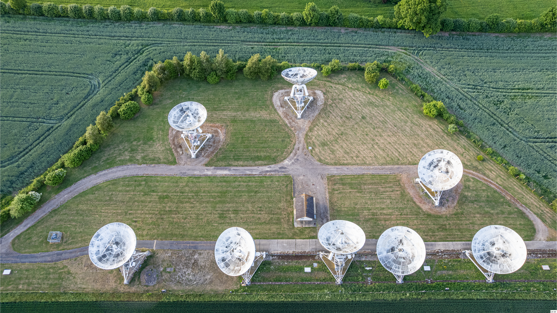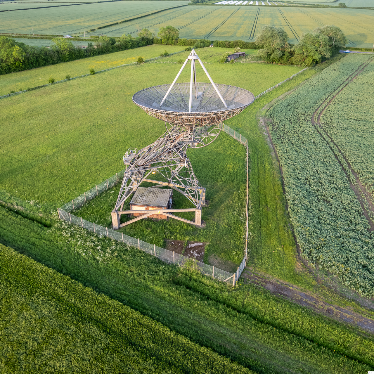 Cambridge University’s Mullard Radio Astronomy Laboratory, at Lord’s Bridge, near Barton. Built a decontaminated WW2 mustard gas depot! The line of white dishes sits on the route of the old Oxford-Cambridge railway.
