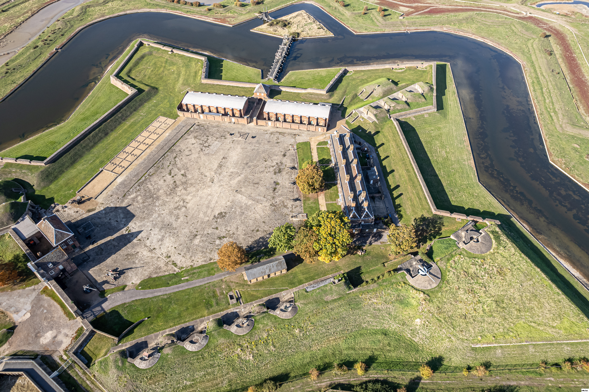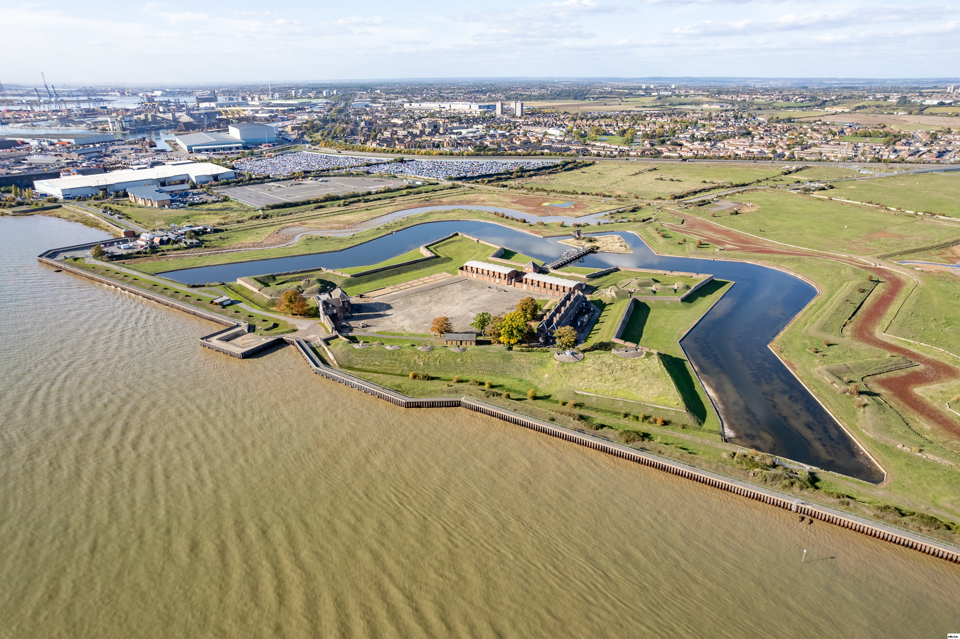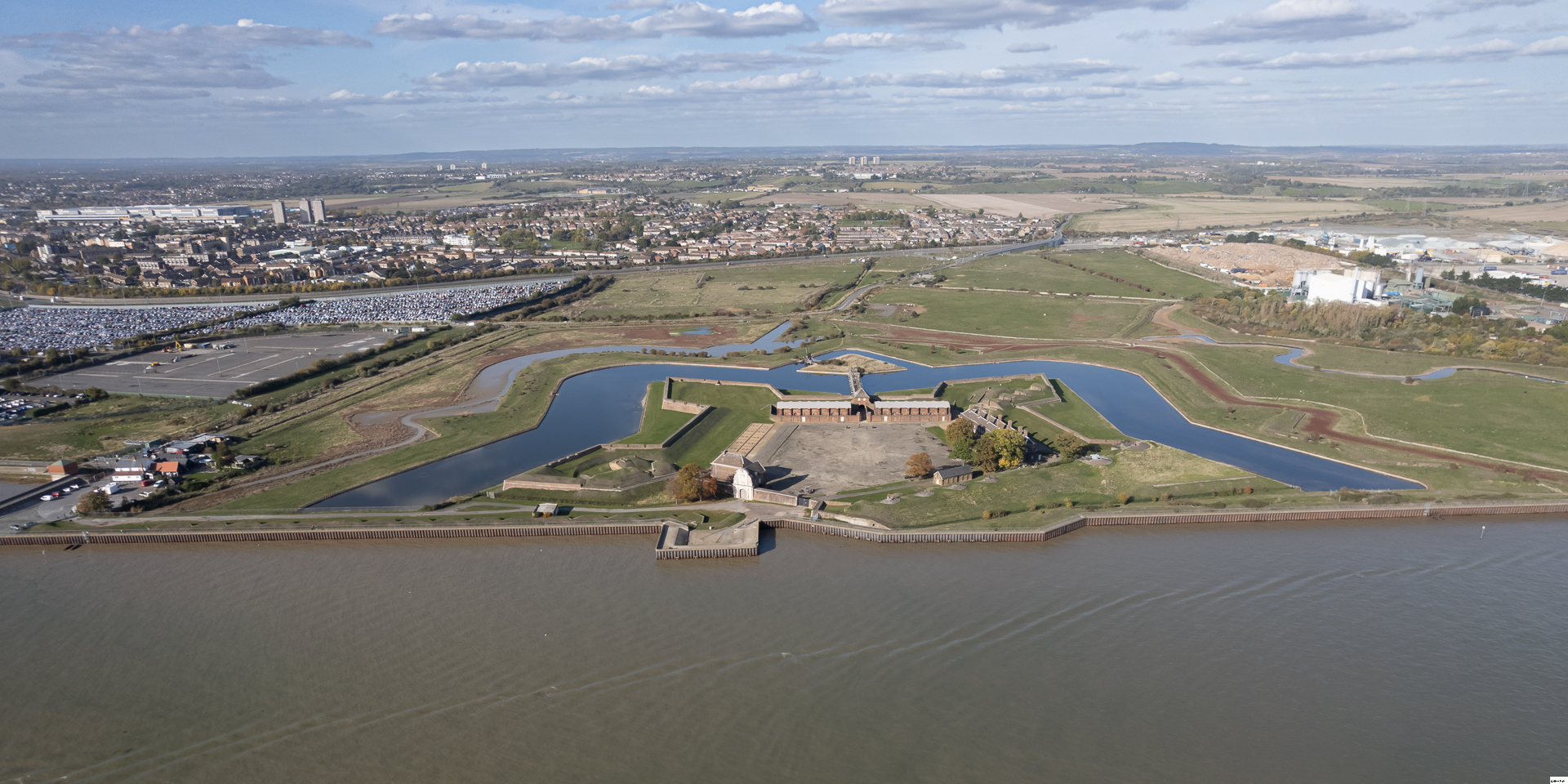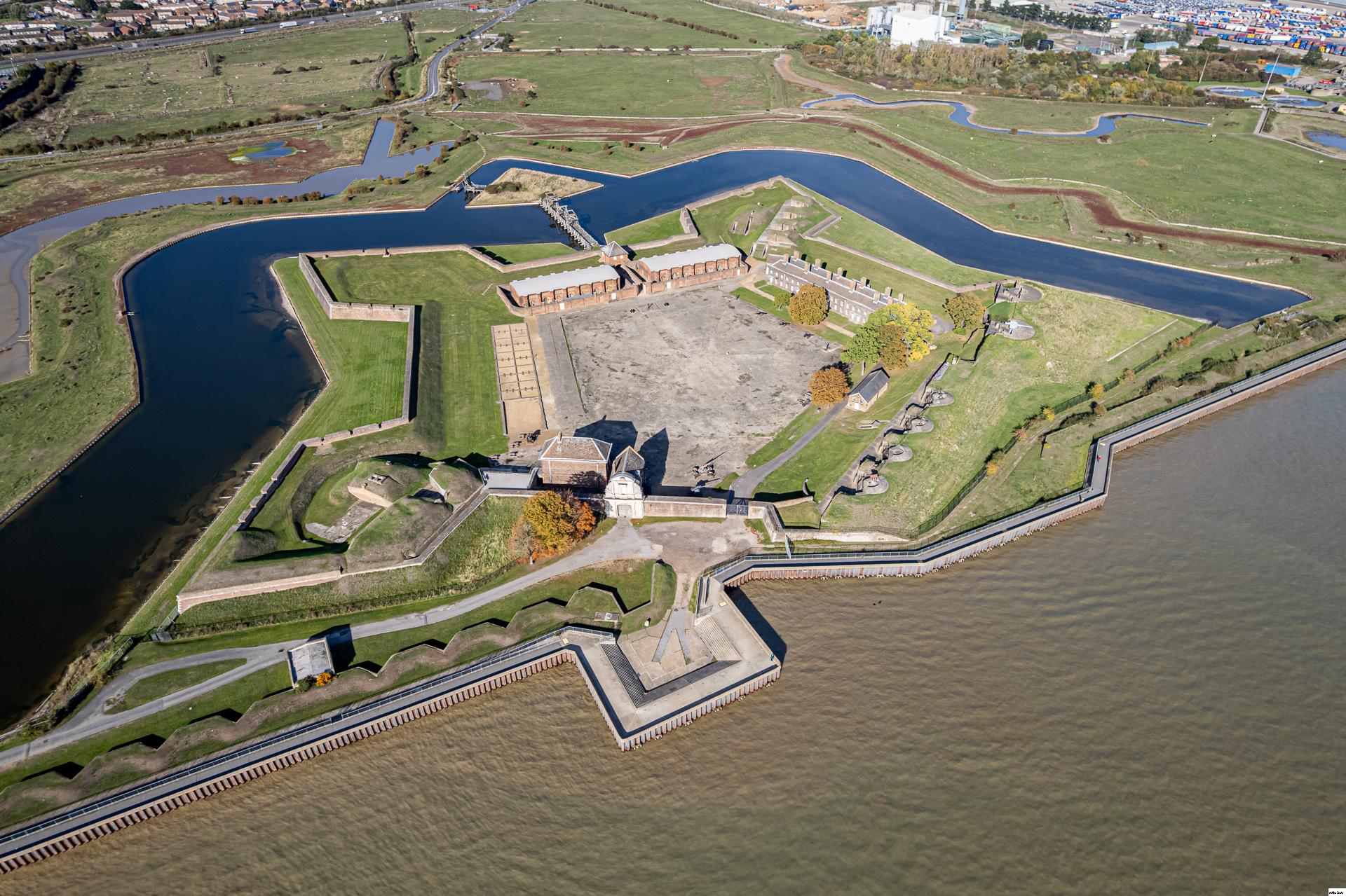 A Napoleonic era fort on the north bank of the Thames estuary. Built in the Vauban star-shaped style, with multiple layers of defences. The naval guns were a WW2 addition.